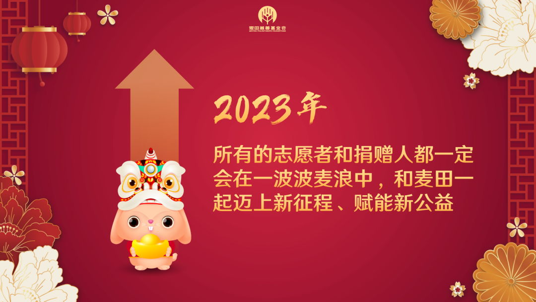 今天我们共赴家宴,庆祝2022的累累硕果 今天我们欢聚一堂,展望2023的全新征程 感谢大家在2022年对麦田的支持和喜爱 2023年,麦田会继续秉持初心、为爱赋能 这里也祝愿每一位爱心人士新年快乐、幸福安康!